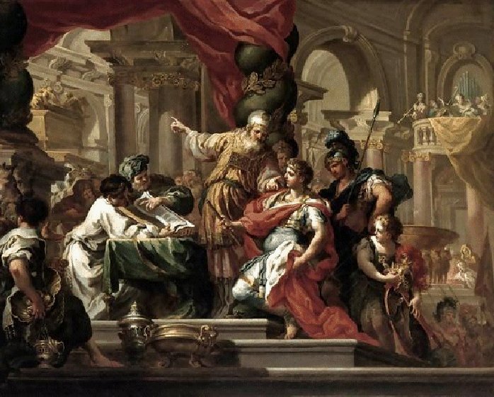 “Alexander went to Jerusalem after having taken Gaza. Jaddua, the high priest, had a warning from God received in a dream, in which he saw himself vested in a purple robe, with his miter—that had the golden plate on which the name of God was engraved—on his head. Accordingly he went to meet Alexander at Sapha ("View" [of the Temple]). Followed by the priests, all clothed in fine linen, and by a multitude of citizens, Jaddua awaited the coming of the king. When Alexander saw the high priest, he reverenced God (Lev. R. xiii., end), and saluted Jaddua; while the Jews with one voice greeted Alexander. When Parmenio, the general, gave expression to the army's surprise at Alexander's extraordinary act—that one who ought to be adored by all as king should adore the high priest of the Jews—Alexander replied: "I did not adore him, but the God who hath honored him with this high-priesthood; for I saw this very person in a dream, in this very habit, when I was at Dios in Macedonia, who, when I was considering with myself how I might obtain dominion of Asia, exhorted me to make no delay, but boldly to pass over the sea, promising that he would conduct my army, and would give me the dominion over the Persians." Alexander then gave the high priest his right hand, and went into the Temple and "offered sacrifice to God according to the high priest's direction," treating the whole priesthood magnificently.
